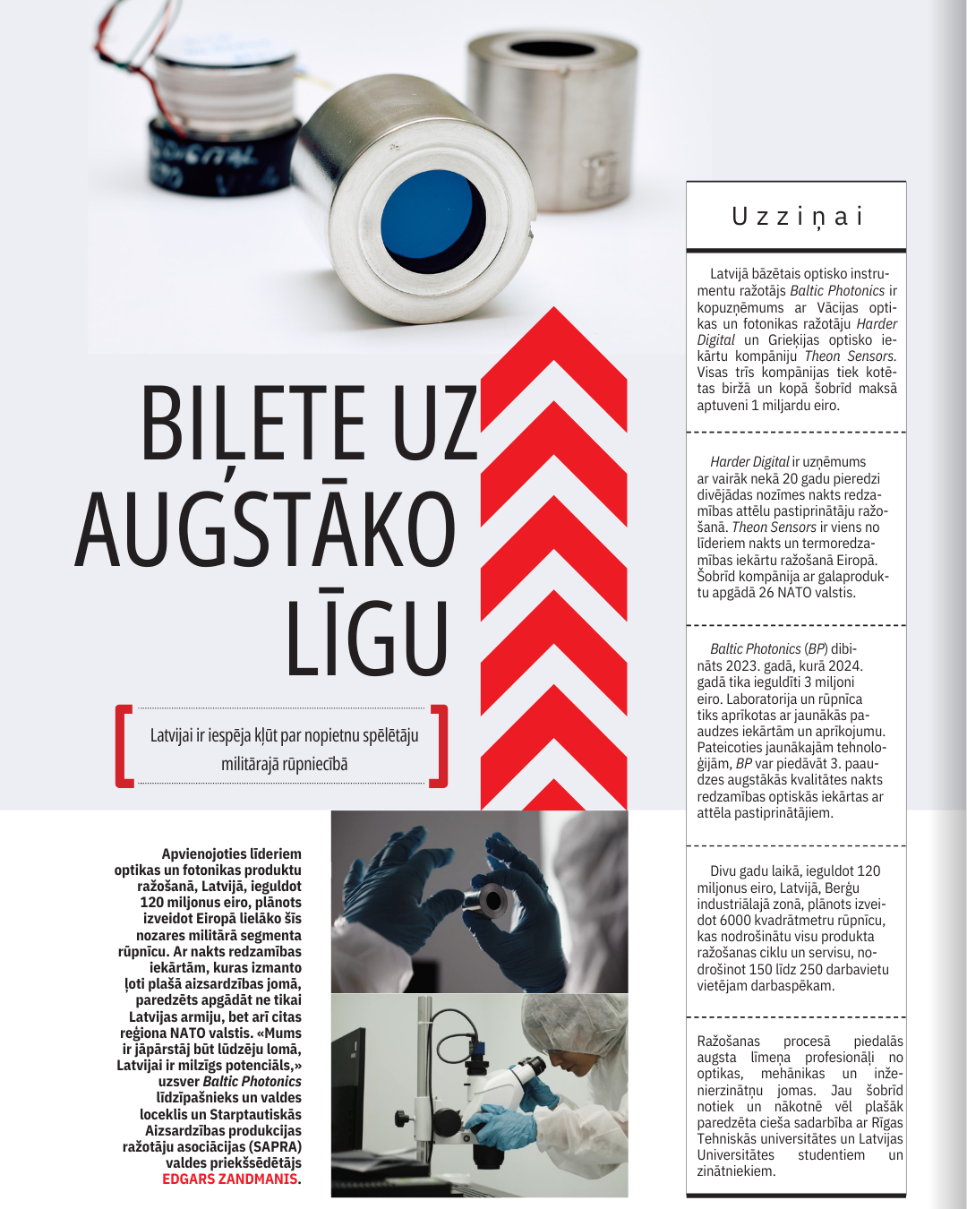 Biļete uz Augstāko Līgu 03/02/2025Biļete uz Augstāko LīguLasīt vairākLatvija sper nozīmīgu soli aizsardzības industrijā – Baltic Photonics sadarbībā ar starptautiskajiem partneriem veic lielas investīcijas jaunas rūpnīcas izveidē.